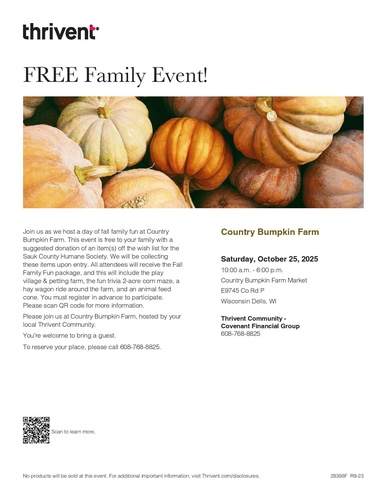 Join us at Country Bumpkin Farm, hosted by your local Thrivent Community, for a day of FREE Fall Family Fun! This event is free to your family with a suggested donation of an item(s) off the wish list for the Sauk County Humane Society. We will be collecting these items upon entry.